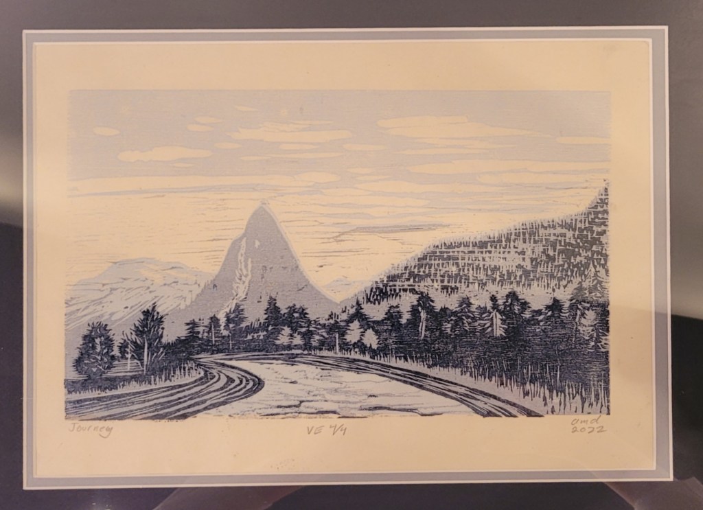 I’ve created this image in a small edition of 4 using the reduction method with woodcuts. Only one block is used, but the wood is gradually carved away, destroying the block as I work.